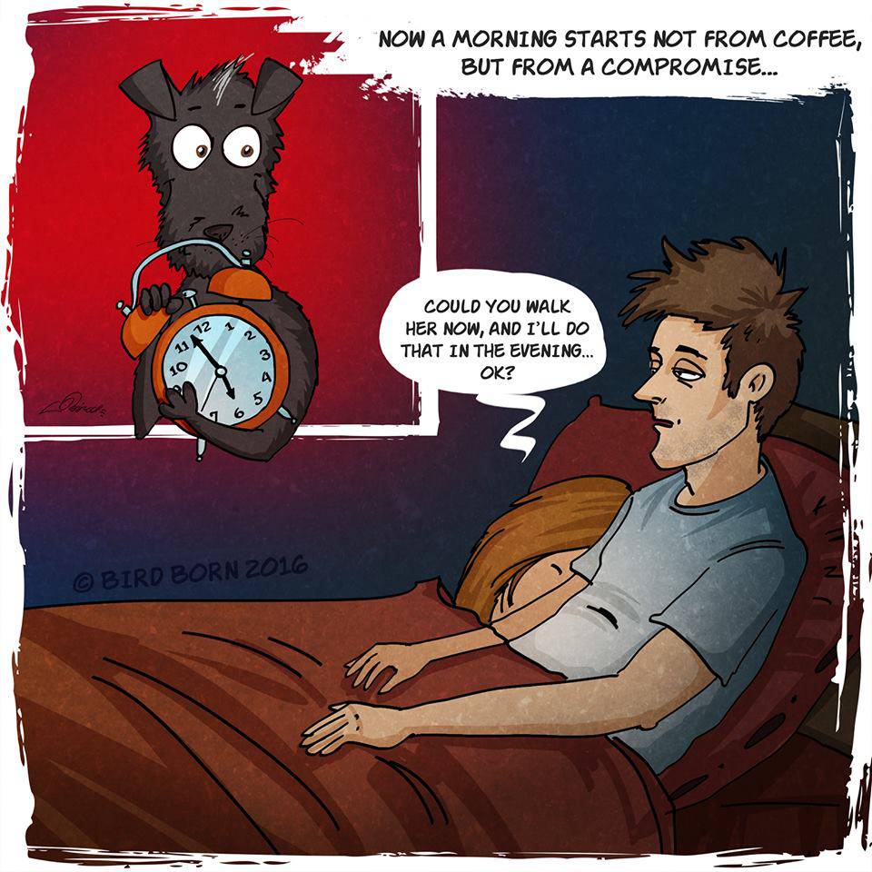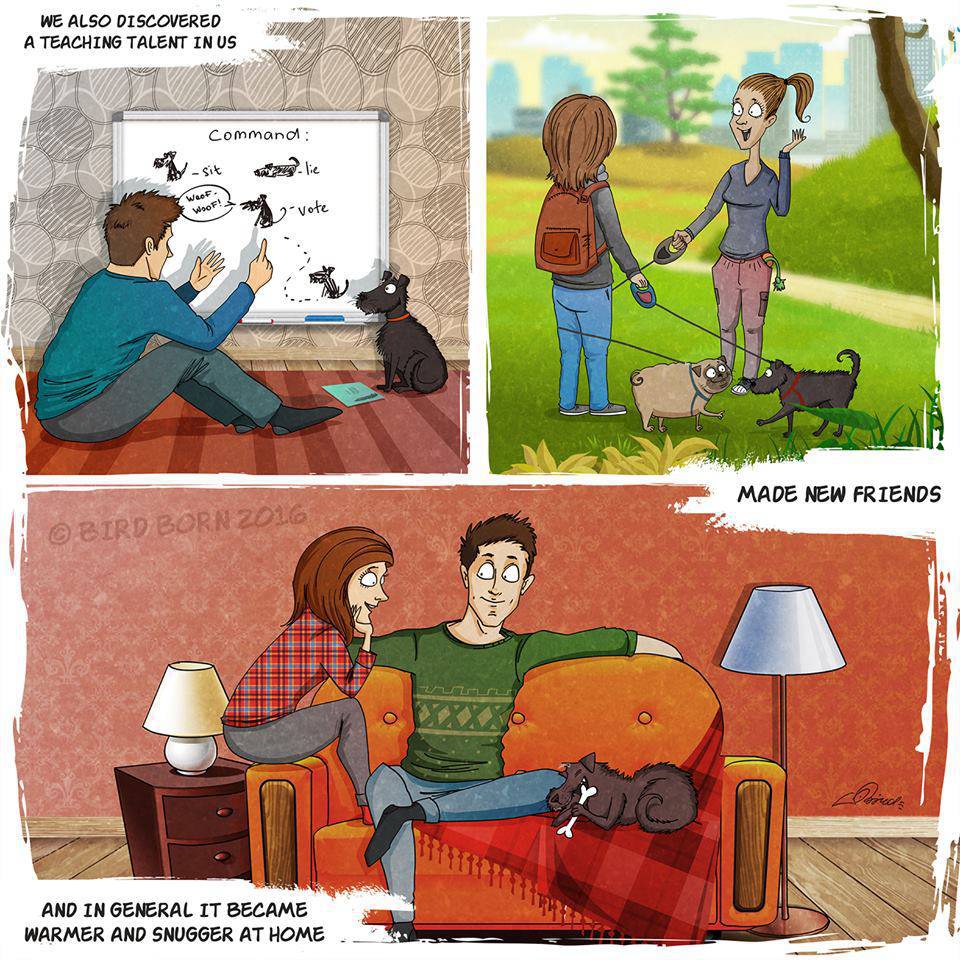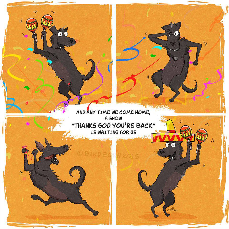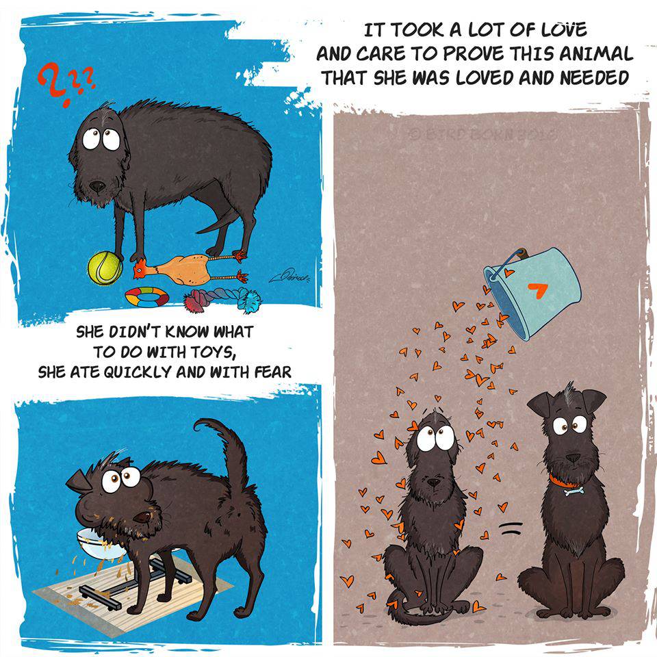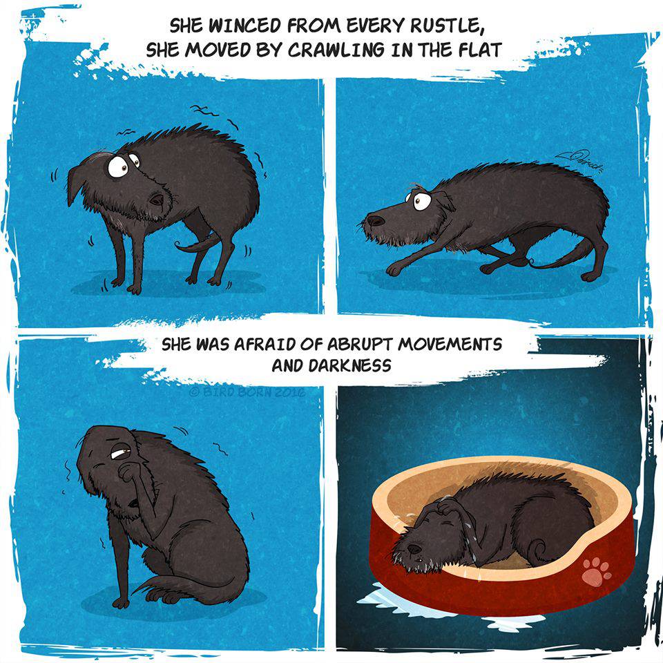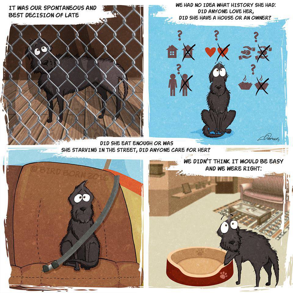 Ma nella vita di Bird Born è entrato a far parte un nuovo personaggio: un piccolo cane nero adottato in un canile. Questa esperienza straordinaria ha dato l’ispirazione giusta all’illustratore che ha creato una nuova serie di vignette nelle quali racconta come quel piccolo essere si sia lentamente adattato alla sua nuova vita, imparando a superare le sue paure fino a che un giorno non ha capito che finalmente non doveva temere più nulla.