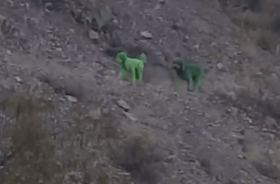 A El Paso nei pressi del McKelligon Canyon alcuni escursionisti hanno effettuato delle riprese piuttosto sconcertanti, segnalando la presenza di due cani color verde. Non si tratta di piccoli esseri alieni, né tanto meno di uno scherzo o una bravata. Infatti, i cani, due barboni, di nome Millie e Max, appartengono ad un signore che vive in una tenuta a ridosso del canyon.