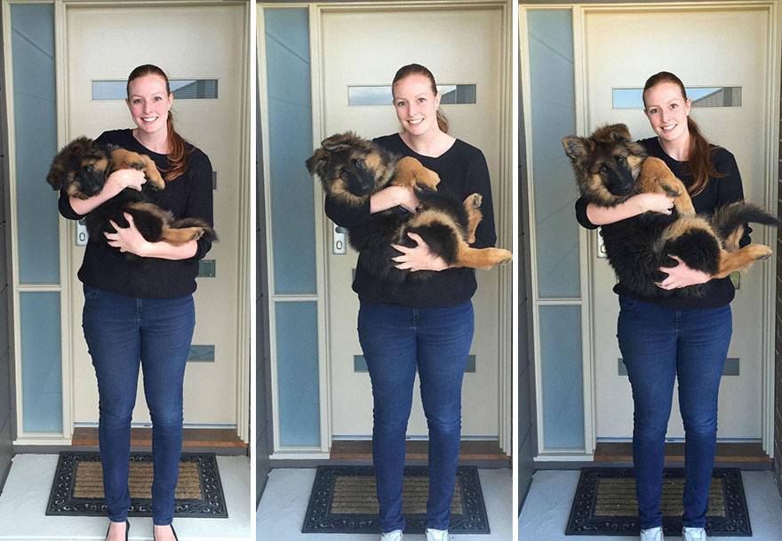 Alex e Ashley, una coppia australiana, hanno avuto la stessa idea e hanno documentato la crescita del loro pastore tedesco a pelo lungo, di nome Nasra, dalle sue otto settimane agli otto mesi, attraverso una serie di fotografie sempre nella stessa posizione: ovvero Nasra tra le braccia della sua padrona fino a quando è diventata troppo grande.