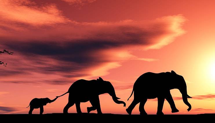Il piccolo elefante si aggrappa, con la proboscide, alla coda della mamma (o del papà). Uno scatto davvero tenero.
