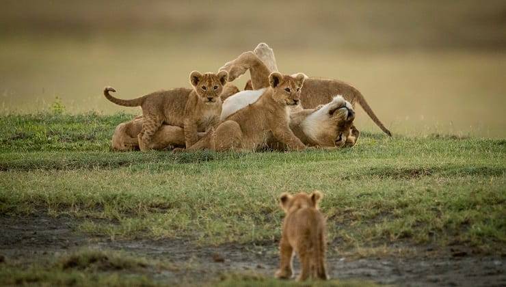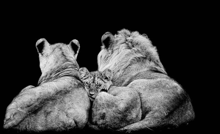 Questo piccolo leoncino è stretto tra mamma e papà e sembra prendersi tutte le coccole e il calore possibili.
