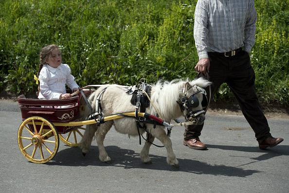 A girl travels in a miniature horse-drawn carriage on the opening day of the annual Appleby Horse Fair, in the town of Appleby-in-Westmorland, North West England on June 4, 2015. The annual event attracts thousands of travellers from across Britain to gather and buy and sell horses. AFP PHOTO / OLI SCARFF (Photo credit should read OLI SCARFF/AFP/Getty Images)
