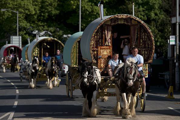 People ride their vardos, or traditional horse-drawn caravans, along a road on the opening day of the annual Appleby Horse Fair, in the town of Appleby-in-Westmorland, North West England on June 4, 2015. The annual event attracts thousands of travellers from across Britain to gather and buy and sell horses. AFP PHOTO / OLI SCARFF (Photo credit should read OLI SCARFF/AFP/Getty Images)