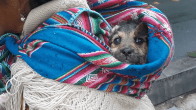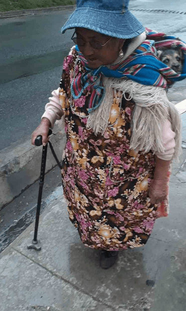 La signora Delfina vive in un quartiere di La Paz in Bolivia e tutti i giorni percorre la stessa strada con sulle spalle il suo dolce compagno a 4zampe. Un simpatico meticcio di piccola taglia, simile ad uno yorkshire, che l’anziana signora avvolge con uno scialle coloratissimo, tipico delle etnie locali, che si lega al corpo.