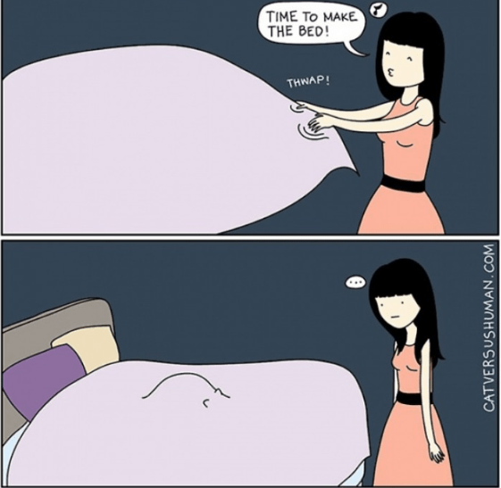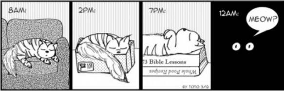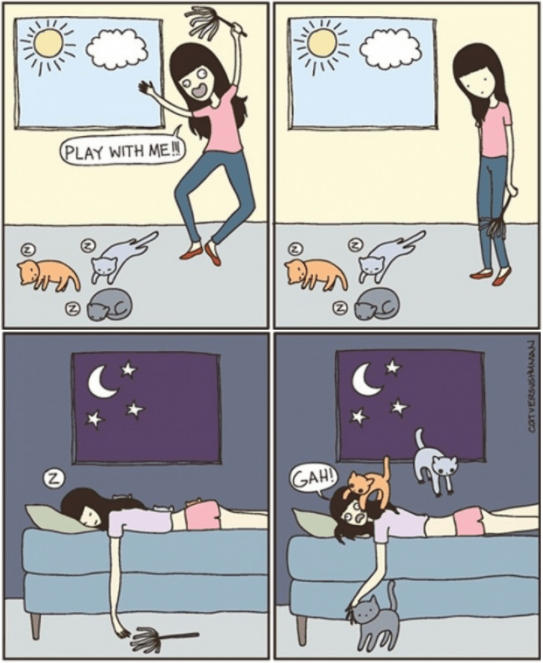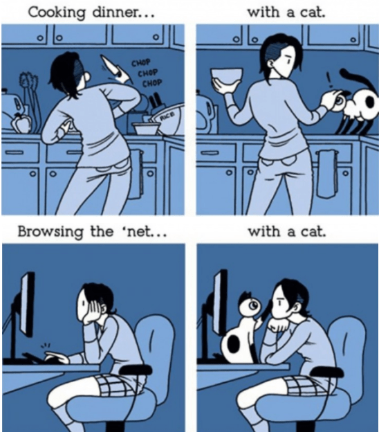 Quella vita quotidiana in compagnia di un gatto in una serie di vignette divertenti. La vita quotidiana con i nostri compagni a 4zampe riempie le giornate. Cani e gatti, conigli o altri pelosetti hanno l’arte di rendere l’ambiente in cui viviamo pieno di energie e di allegria e, nonostante i sacrifici, riservano sempre delle piacevoli sorprese, riportando le persone alla semplicità in ogni azione grazie al loro essere spontaneo. E’ forse in questo che si cela il loro segreto. Vivere con un animale domestico non è una decisione di prendere alla leggera ma quando una persona decide di accogliere un compagno a 4zampe, sicuramente scoprirà un mondo nuovo e non si annoierà. Tra le specie più diffuse, il gatto è sicuramente ben diverso dal cane, un mondo a parte come viene tra l’altro illustrato in molte vignette divertenti. Si tratta di un animale dal carattere indipendente e piuttosto esigente con l’alimentazione. Il felino domestico non accetta ordini e la sua indole da cacciatore lo porta ad andare in esplorazione durante la notte e a poltrire nell’arco del giorno.
