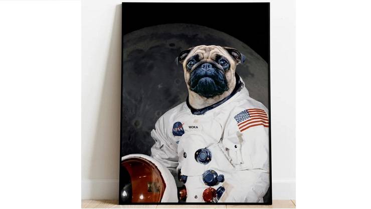 Ritratti di cani, gatti e animali domestici divertenti che “diventano! astronauti, pittori, motociclisti etc. In commercio ce ne sono tanti e tutti colorati e divertenti. Costo a partire da 30 euro.