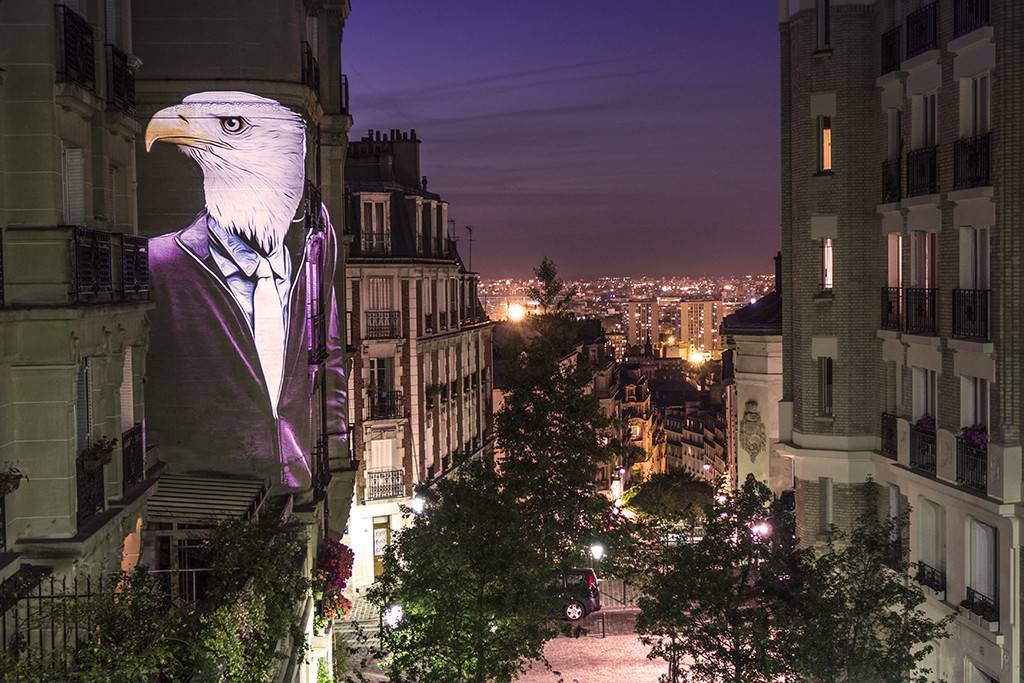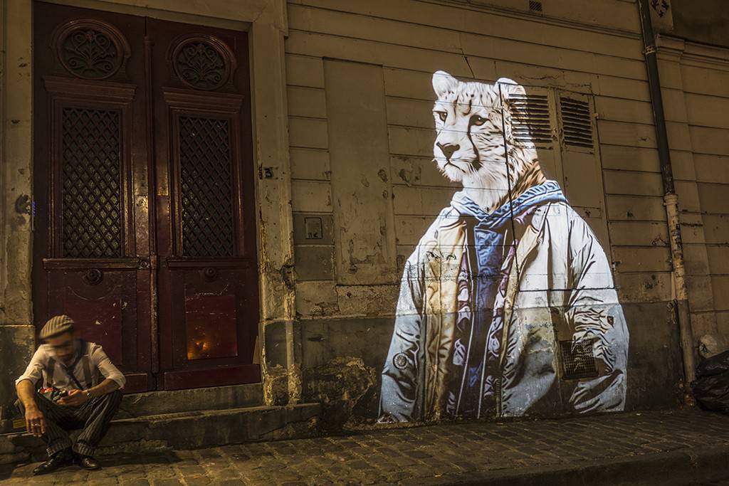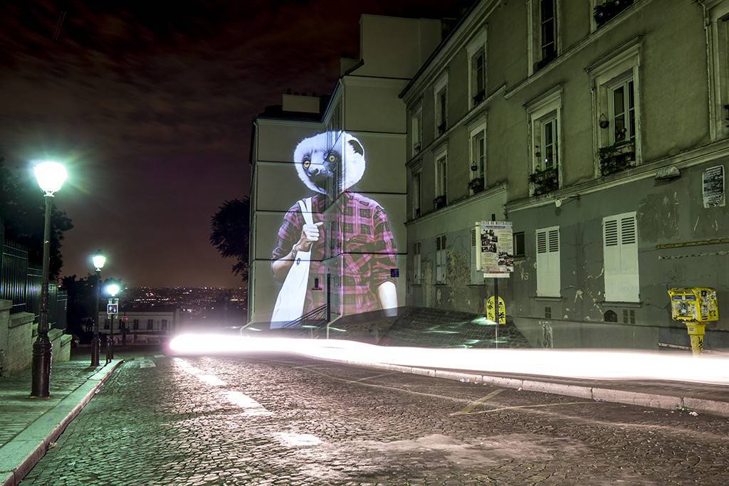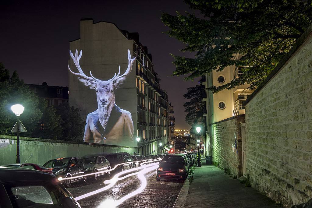 Il fondatore di uno studio di design L3 parigino, Julien Nonnon ha realizzato un interessante quanto faraonica impresa per le vie della capitale francese con protagonisti personaggi ibridi metà umani e metà animali, in pieno stile hipster. L’artista ha creato una serie di proiezioni visive, innovando il graffitismi e muralismo urbano, che hanno animato le facciate di alcuni palazzi di Parigi, proponendo ai visitatori un safari urbano nella giungla della città. La serie “Manimals” propone esseri ibridi che hanno molta classe con la quale Nonnon porta il fruitore ad interrogarsi sulla dualità del desiderio umano, diviso tra il bisogno di distinguersi e quello di appartenere ad un gruppo.