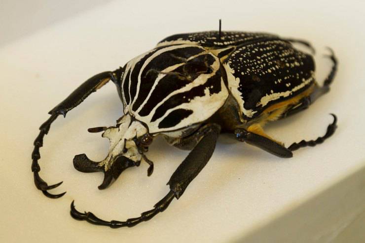 - Il Goliathus orientalis vive in Congo e Tanzania e misura 50-90 millimetri (maschi) e 50-65 millimetri (femmine). Si nutre di frutta e linfa degli alberi. Ha un aspetto più corto e più robusto dei suoi “cugini”. Il corpo è principalmente bianco, con scarabocchi neri lungo la schiena, mentre le ali sono nere o nerastre. I Goliathus orientalis sono una delle sottospecie più grandi. Alcune delle loro femmine possono essere più grandi dei maschi adulti di altre razze.