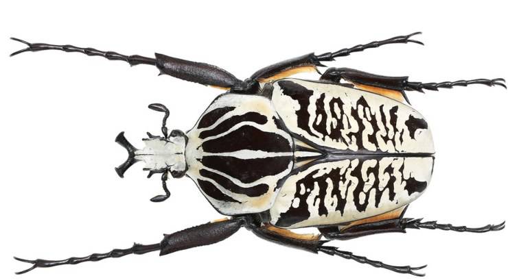 - Il Goliathus albosignatus, che vive in Mozambico, Sudafrica, Tanzania, Zimbabwe e ha dimensioni di 45-70 millimetri (maschi) e 40-50 millimetri (femmine). Si nutre di frutta e linfa degli alberi e ha una caratteristica colorazione “a scheletro”. Questo scarabeo infatti ha il corpo di colore in bianco e nero, con insoliti motivi sulla schiena e sull’addome. Alcune persone le chiamano ossa; altre persone li chiamano polvere di stelle o strisce. In ogni caso, sa come farsi notare! Inoltre, è una specie più piccole di scarabei golia.