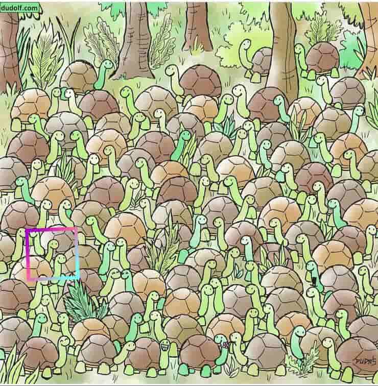 Se nonostante il tempo a disposizione, non siete riusciti ancora a vedere dove è nascosto il serpente, scorrete verso il basso e scoprite la soluzione del test visivo delle tartarughe.