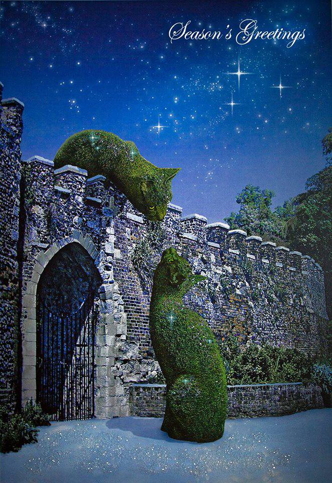 Diverse elaborazioni grafiche creano delle composizione nelle quali cespugli tagliati a forma di micio dominano la scena.