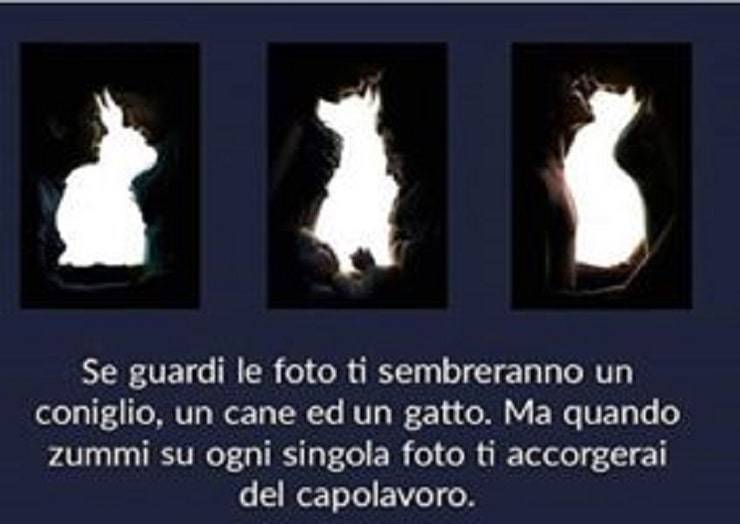 Una illusione ottica bellissima: da lontano vedi coniglio, cane e gatto ma se fai lo zoom su ogni singola foto scoprirai un capolavoro.
