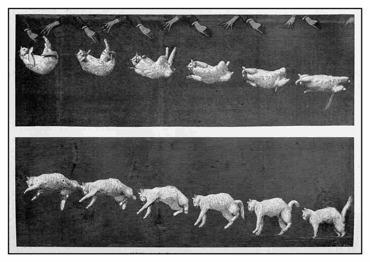 Il primo gesto che esegue il gatto nel momento della caduta è quello di raddrizzare testa e collo. In un secondo momento il micio applica la legge della fisica sulla conservazione del movimento angolare.