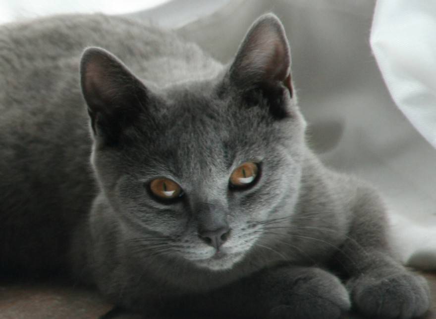 Questo gatto si distingue per il pelo dal colore blu sfumato grigio, ma non solo: ha dei particolarissimi occhi a mandorla, labbra e tartufo grigi, testa a forma di cuneo con mantello corto e allo stesso tempo folto. Il blu di Russia, infatti, ha un sottopelo abbondante che fa apparire sempre sollevata la sua pelliccia.