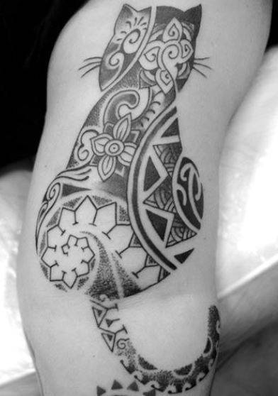 Un altro esempio di stile maori applicato alla figura. Anziché delinearla, qui il tattoo maori riempie la sagoma del gatto di schiena.