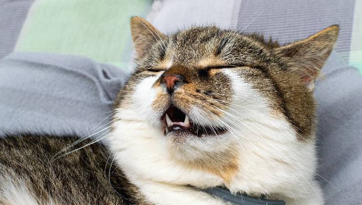 - espressione di disagio: il gatto potrebbe miagolare in modo inconsueto, ansimare pesantemente e rannicchiarsi in una posizione protettiva.