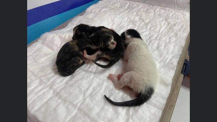 Hanno resistito 11 ore al gelo i gattini appena nati gettati in una scatola piena di rifiuti. Una dolce mamma gatta li ha adottati