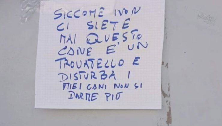“Siccome non ci siete mai“, si legge sul biglietto d’accusa: “questo cane è un trovatello e disturba i miei cani“. La preoccupazione della donna sarebbe dunque quella che “non si dorme più” per colpa della cagnolina. La risposta per chiunque abbia commesso un simile gesto non è tardata ad arrivare, sia dalla diretta interessata – propostasi di accogliere la pelosetta in attesa che trovi la famiglia che merita – che dalla comunità locale.