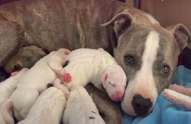 Nessuno si sarebbe aspettato un travaglio imminente ma così è stato e dopo poco la cagnolina ha dato alla luce il suo primo piccolo a cui ne sono seguiti altri. Da mamma amorevole come aveva subito dimostrato di essere la cucciola ha pulito uno ad uno i suoi bambini leccandoli ed asciugandoli fino all’ultimo, venuto fuori dopo diverse ore. Alle fine sono stati 6 i cuccioli dati alla luce, solo uno uguale a lei ed altri 5 bianchi con qualche macchiolina nera, tutti sani e bellissimi.