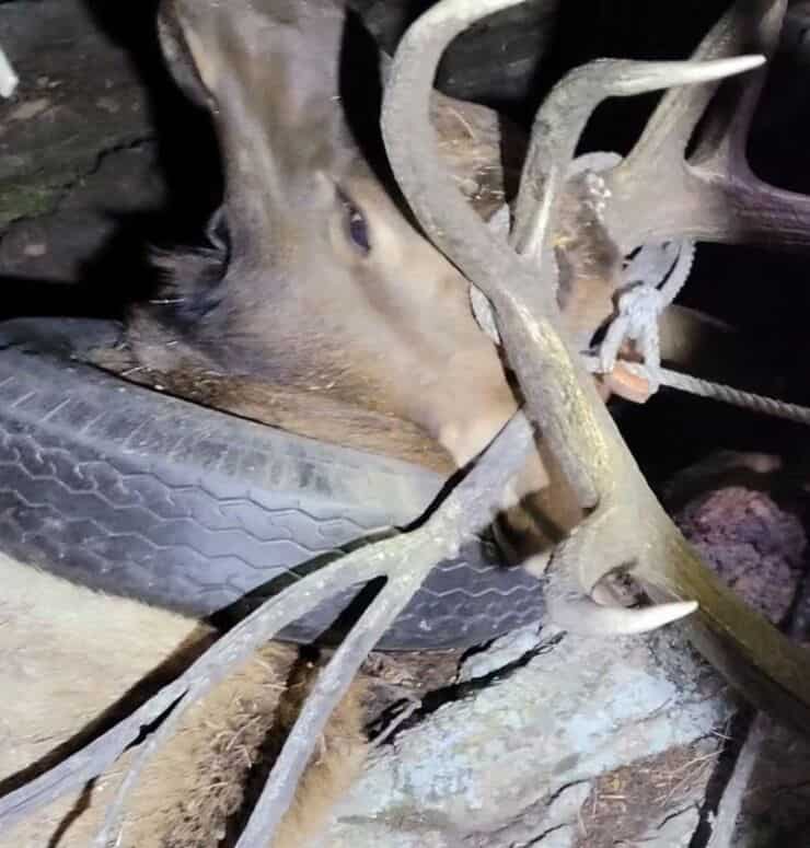 Con un tranquillante è stato possibile avvicinare senza pericoli l’alce. Purtroppo però, la rimozione della gomma ha richiesto un ulteriore sacrificio da parte dell’animale. Le sue corna sono state rimosse per poter estrarre lo pneumatico senza far ulteriore male all’animale.