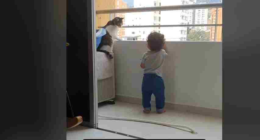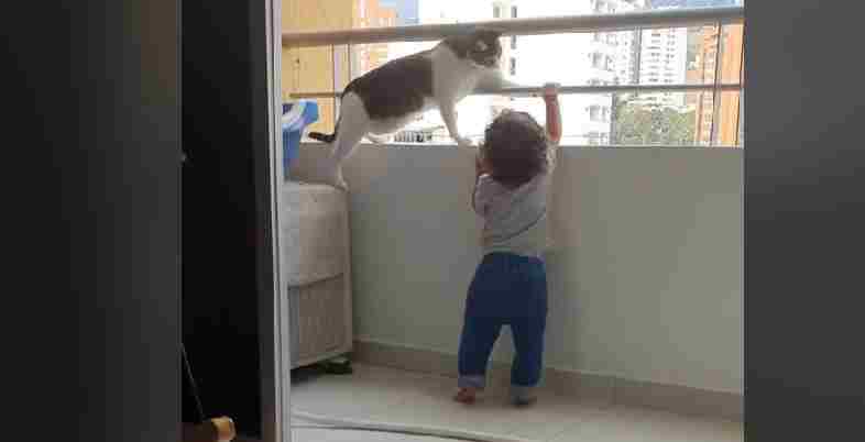 Evita che il bimbo si arrampichi dal balcone del palazzo in una maniera unica, la gatta di casa merita un encomio per quanto fatto vedere!