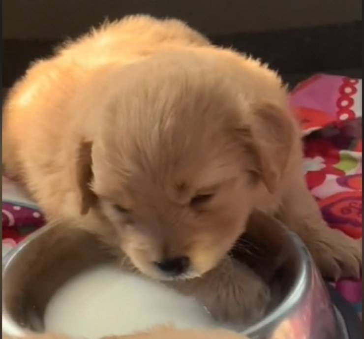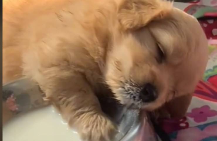 Non sa se ha fame o sonno: il video del tenero cucciolo di Golden Retriever che si addormenta sulla ciotolina di latte