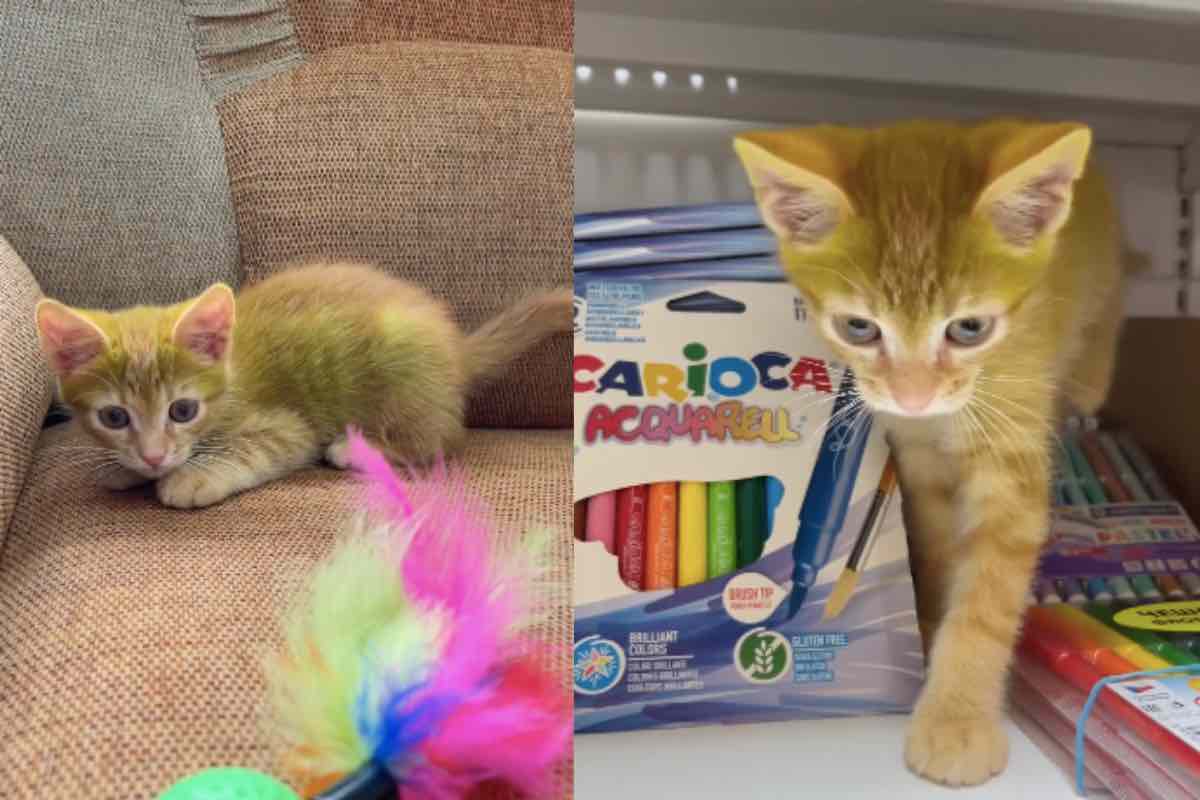 Se anche voi vi state chiedendo: come faccia il suo pelo ad essere verde, oppure: “cosa è successo di male a questo gattino?” Allora sappiate di star seguendo l’intuizione sbagliata. Eraser, nonché il piccolo micio protagonista di questa vicenda, non è stato coinvolto in nulla di strambo, dannoso o insolito. Eraser “non è” neppure “rotolato nell’erba“, spiega con decisione chi lo ha salvato dalla strada lo scorso mese di settembre. L’uomo consiglia anche di non farsi dai numerosi pennarelli che popolano il suo ufficio. Quando ha incontrato per la prima volta Eraser lui, almeno, da ciò racconta, sostiene che era già così. E sembra inoltre che anche gli stessi i veterinari abbiano validato infine tale affermazione.