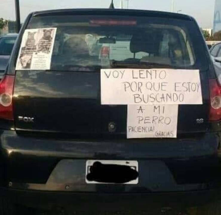 “Vado lento perché sto cercando il mio cane. Pazienta! Grazie”.