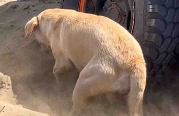 Un’auto resta bloccata inaspettatamente nella sabbia e un cane cerca in tutti i modi di dissotterrarla, il video è virale.Il cane mentre scava (heyitssalann- TikTok)