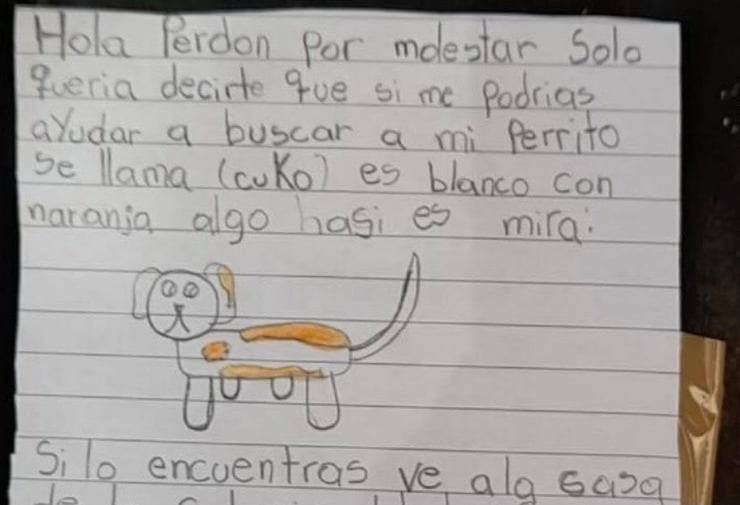 “Ciao, scusa per il disturbo, volevo solo chiedere se mi potevi aiutare” inizia così la letterina scritta con tanto amore e speranza nel ritrovamento. Prosegue chiedendo aiuto, e descrivendo il suo cagnolino, specificando che è arancione e bianco, facendo un meraviglioso e dolcissimo disegno del suo cucciolo. Conclude con le informazioni dove riportarlo, “se lo trovi vai alla casa della Colonia del Bosque, c’è un portone nero“, e con i dettagli della ricompensa.
