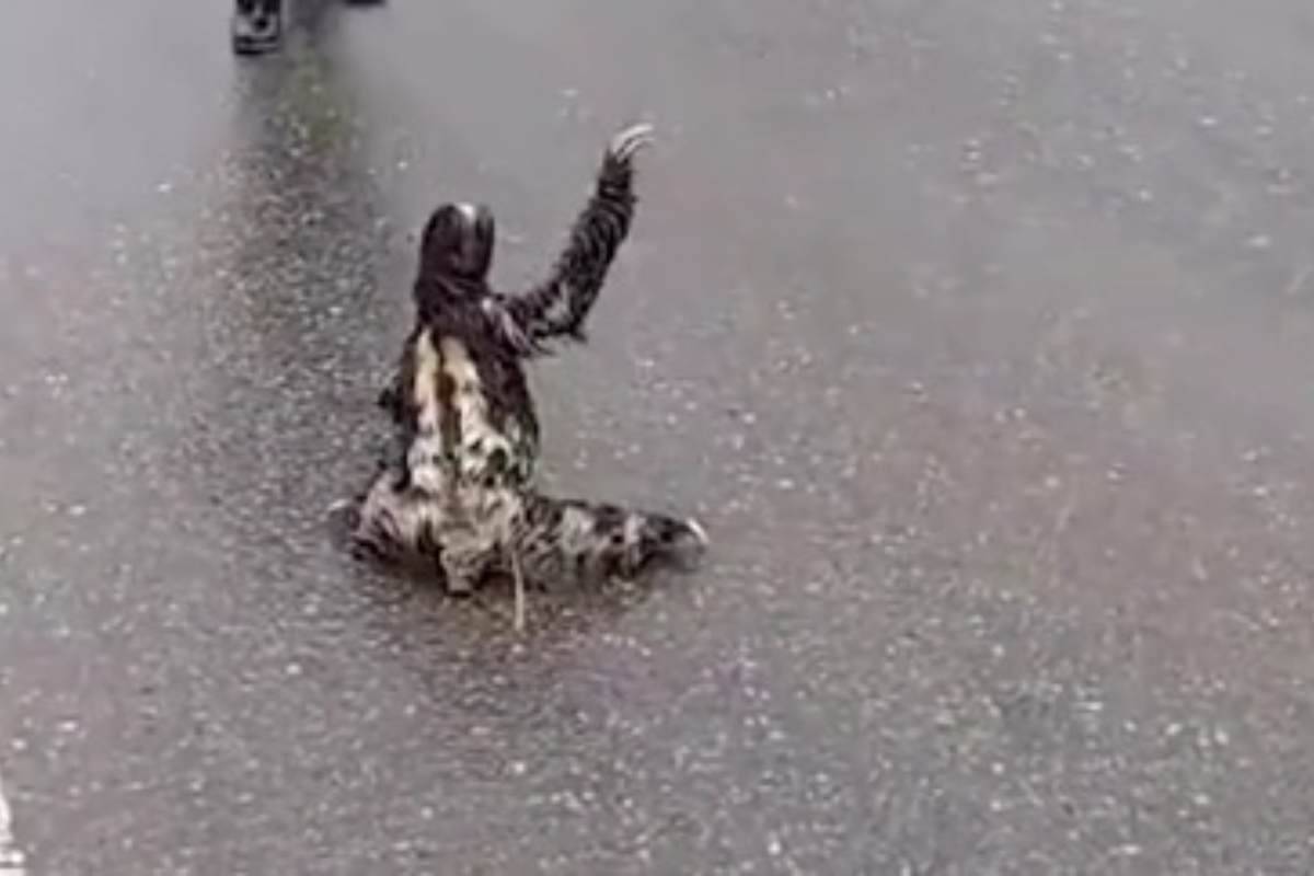Un bradipo, intento a voler attraversare la strada, saluta le macchine di passaggio e il video è subito virale.