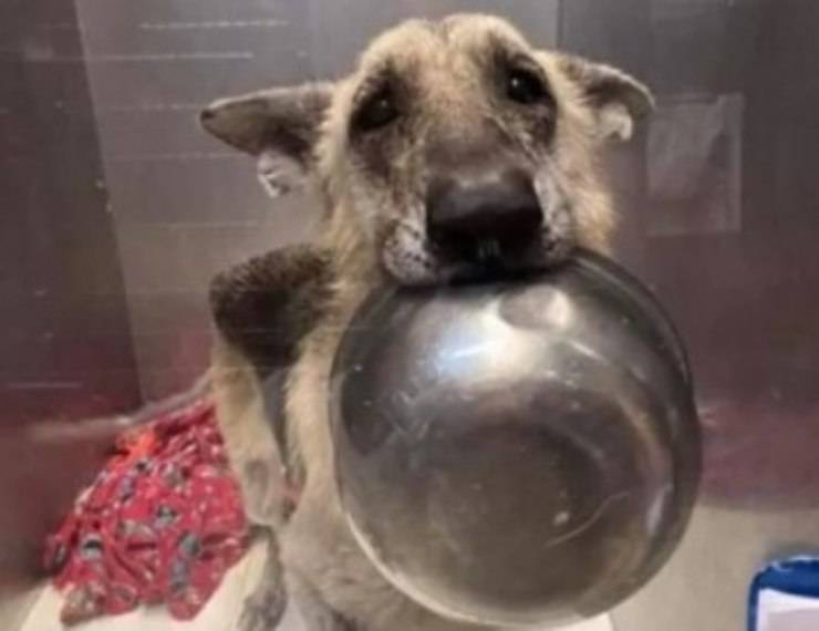 La cagnolina chiede attenzioni agli uomini che vengono nel rifugio: spera di farsi notare e di farsi adottare usando una strategia che ha dell’incredibile. La cucciola, infatti, prende in bocca la ciotola che è a sua disposizione, abbassa le orecchie, assume uno sguardo languido e fissa il passante di turno. Una scena tenerissima, come dimostra la foto qui sopra, che punta a intenerire l’umano che incrocia quegli occhi.