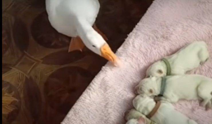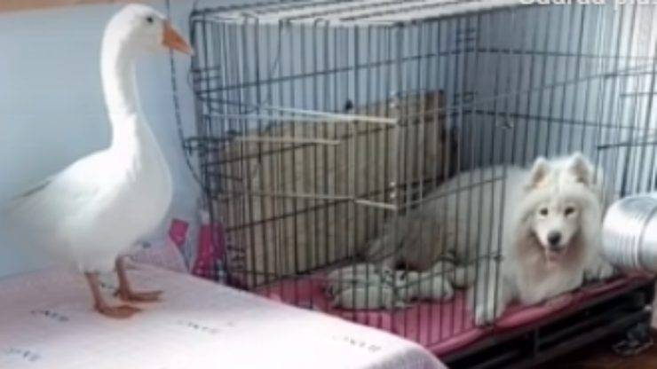 Cagnolina chiede aiuto all’oca per accudire i cuccioli, un affetto grandissimo