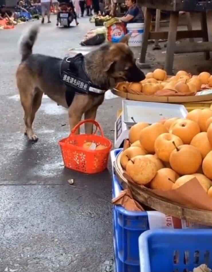 E’ diventato virale il video che immortala la cagnolina che con il suo cestino va al mercato a comprare delle mele