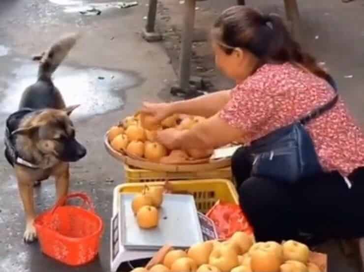 La quattro zampe però, non sembra proprio convinta della quantità. C’è qualcosa che non le torna, e perciò resta immobile davanti la bancarella. La donna capendo che il problema fosse nella quantità delle mele, fa segno alla cagnolina di poterne prendere un’altra.