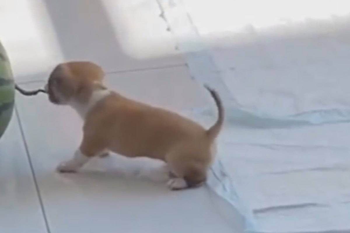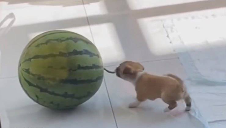 Questo è il caso di un cucciolo di Amstaff, che ha impiegato tutto sé stesso per spostare un grosso cocomero. Nella clip virale si può vedere come il piccolo cagnolino, decisamente minuscolo rispetto all’anguria, cerchi di tirarla verso di sé senza riuscirci.
