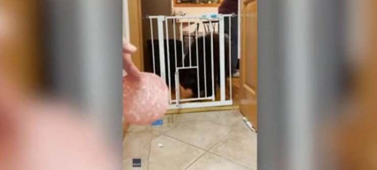 La clip mostra infatti Cassi davanti ad un cancelletto bianco con una piccola gattaiola aperta mentre il signor Cadarlin passa una fetta di salame a sua moglie per e richiamare l’attenzione della cagnolina .