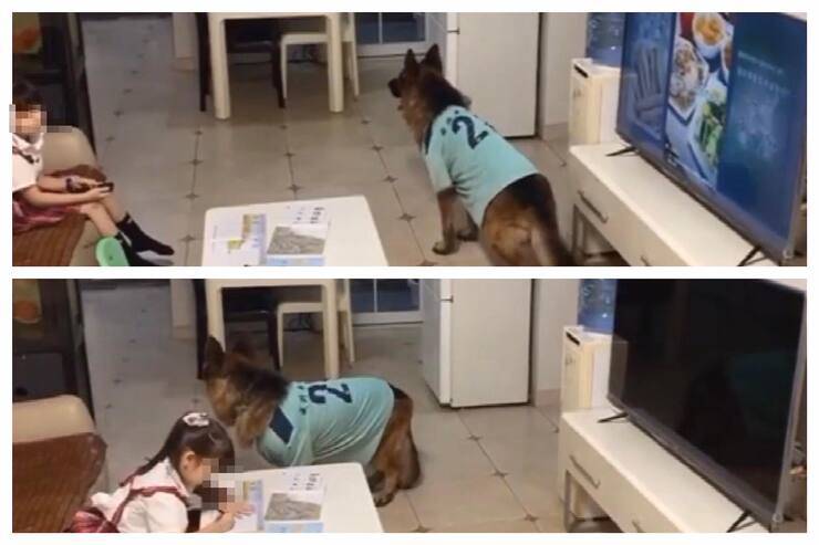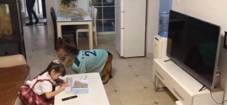Poi, qualcosa allerta il cane che subito abbaia alla sua piccola amica, che inizialmente sembra non capire cosa stia per accadere. Il quattro zampe, indica il tavolo dove sopra sono aperti i quaderni della bambina, che prontamente spenge la fonte della distrazione e si mette a lavoro china sui compiti.