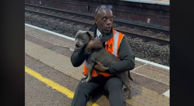 Le rotaie di una ferrovia sono un luogo davvero poco sicuro per un cucciolo, ancora di più se il traffico ferroviario è ancora nel pieno! Un piccolo cane di razza Staffordshire bull terrier è stato salvato da un coraggioso ferroviere mentre si trovava a gironzolare sui binari a pochi istanti dall’arrivo di un convoglio. L’uomo quando ha visto l’animale in pericolo si è calato per poterlo recuperare e lo ha tenuto stretto a sé fino a dopo il passaggio del treno.