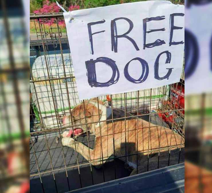 Oltre al maltrattamento la beffa, cane abbandonato in una gabbia con un cartello che recita: “Free dog”