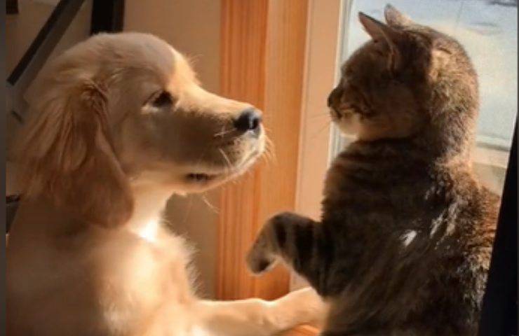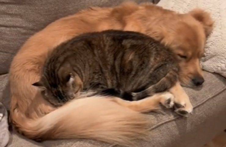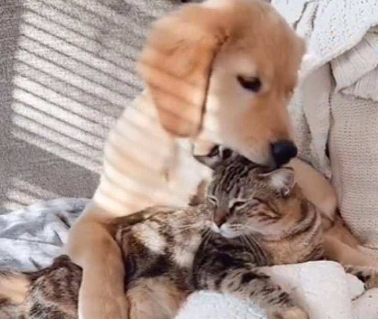 Il filmato condiviso su Tik Tok mostra il rapporto che si è instaurato nel corso di alcuni mesi tra un cucciolo di razza Golden Retriever e un gatto dal manto grigio tigrato. Così scrive nella didascalia, che fa da corredo alle immagini, l’umana che vive insieme ai due quattro zampe: «pensavo che adottare un gatto e prendere un Golden Retriever nello stesso momento fosse una cattiva idea, ma adesso sono migliori amici».
