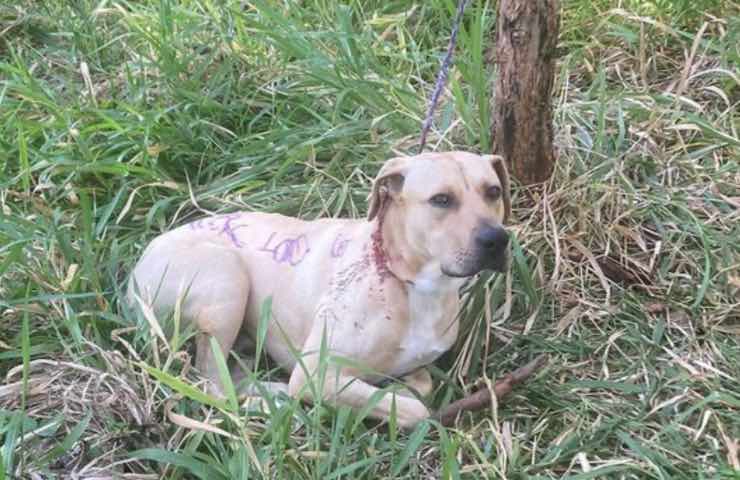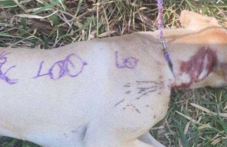 Oltre alle inquietanti – e ancora non ben decifrate – scritte realizzate con inchiostro a penna sul quattro zampe, a preoccupare i suoi soccorritori sarebbe stata un’importante lesione all’altezza del collo. L’abrasione del manto si è estesa intaccando perfino l’orecchio destro del pelosetto che verte ancora in uno stato di shock e paura.