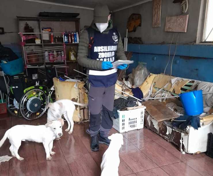 Oltre al cane ferito e lasciato a sé stesso, nell’appartamento si trovavano 4 cuccioli di razza meticcia e uno schnauzer di 4 anni costretti a vivere in un piccolo spazio tra lo sporco delle loro stesse feci e dall’urina. Le Guardie intervenute hanno riferito che l’odore nella stanza era nauseabondo e che difficilmente era possibile stazionare al suo interno. Per concludere, un altro cane viveva in quella casa, un Dogo Argentino recluso sul balcone, forse per dividerlo dagli altri cani. Tutti gli animali sono stati prelevati dall’abitazione e portati anche loro alla ASL del canile per essere visitati e constatare il loro stato di salute.