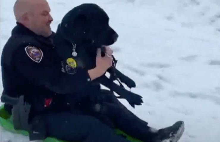Cane Gadget va in slitta con l’ufficiale di polizia: la collina innevata come metafora della loro amicizia – VIDEO