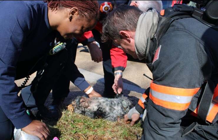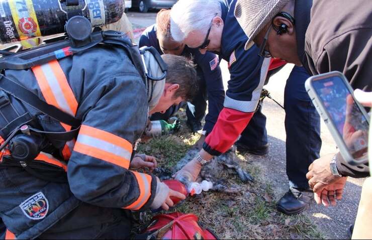 ” Immediatamente il tenente Ryan Smith pensò che il cane non respirasse affatto e che il fumo gli avesse tolto la vita. Il tenente Smith è stato assistito dal vice capo Glen Kneeland, dai FF Tashayla Davis e Justin Cole mentre ascoltavano i suoni respiratori e si preparavano a respirare per il cane.”