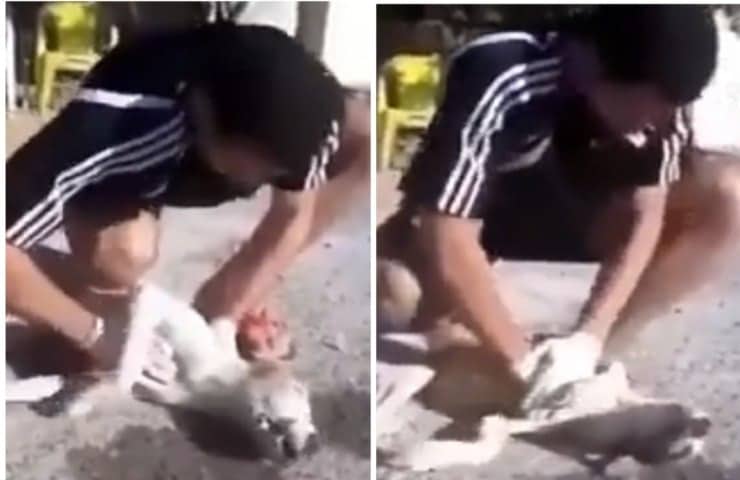 L’eroe del cucciolo ha immediatamente girato il cane sulla schiena iniziando a fare pressione alternatamente sul cuore del cagnolino che continuava a giacere in terra, dando l’impressione che per lui non ci fosse più nulla da fare.