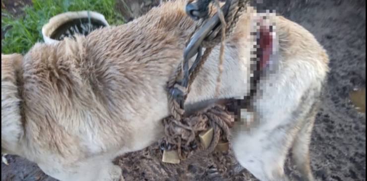 Un atto di violenza spregevole, il povero cane era stato legato ad una catena molto corta, per sfuggire al suo destino il cane aveva cercato incessantemente di liberarsi procurandosi tremende lacerazioni