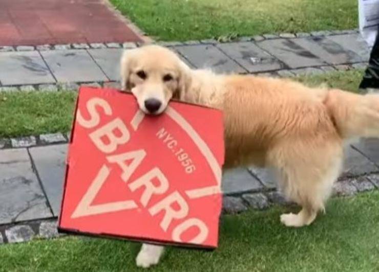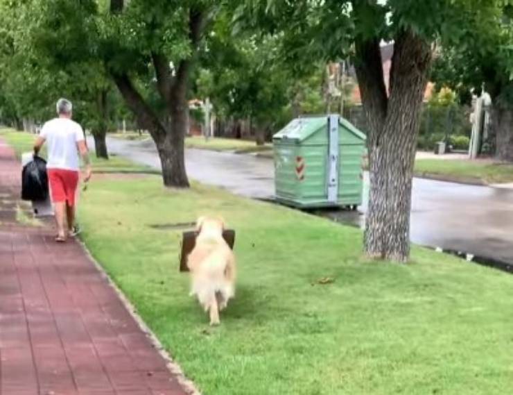 Quando il suo proprietario va fuori casa con un sacco che contiene della spazzatura da gettare nel cassonetto, il golden retriever lo segue. In bocca ha un cartone della pizza e si accoda al suo amico umano per dargli una mano. Il tutto, ovviamente, fatto in maniera spontanea. Così, i due si avviano verso il bidone, ma a un certo punto il quattro zampe si ferma.
