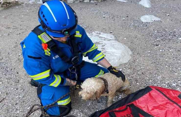 Il cane temerario è stato delicatamente sistemato in una borsa di salvataggio portato in salvo in cima al dirupo. Nonostante i 45 metri di caduta il cane è rimasto praticamente illeso, ma era visibilmente stordito e scosso dalla sua disavventura.