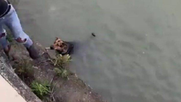 Il cane è caduto nel canale e non riusciva più a risalire rischiando di annegare, in suo soccorso arriva un gruppo di passanti.